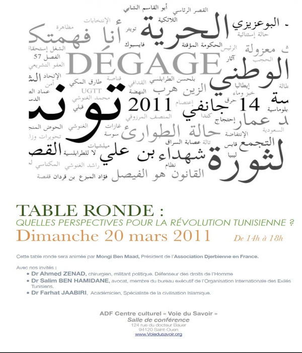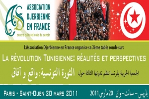 Souhaitant vous faire partager les moments historiques que la Tunisie est en train de vivre, L'Association Djerbienne en France a l’honneur de vous inviter à une table ronde le 20 mars 2011 de 14h à 18h  pour un débat intitulé :
